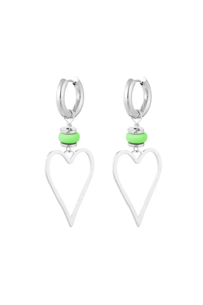 Hoe leuk zijn deze zilveren oorbellen in de vorm van een hartje met kleine groene kraal. De oorbellen zijn gemaakt van Stainless steel, polymeerklei en hematiet.