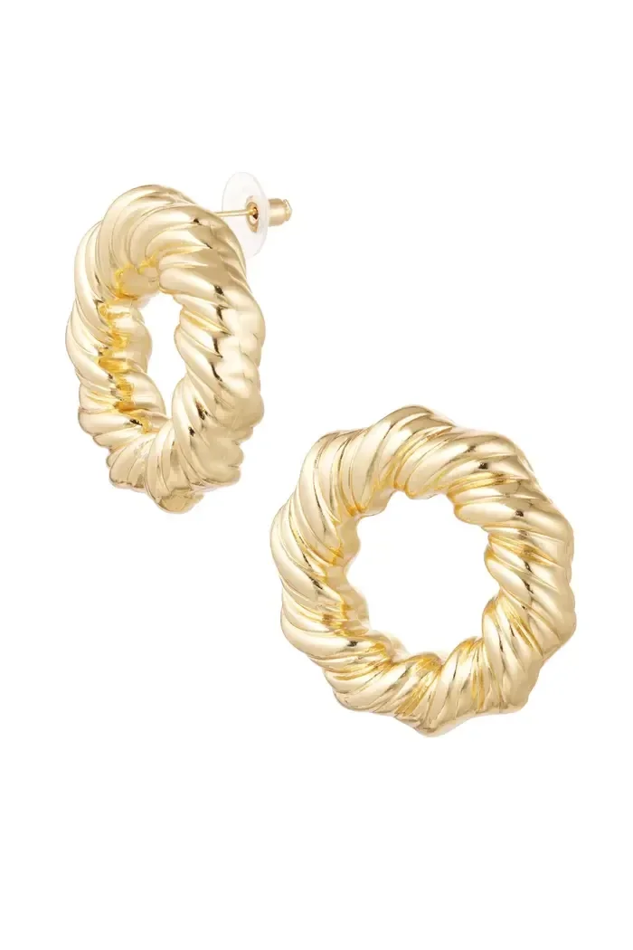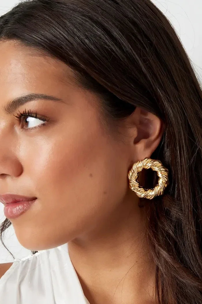 Hoe leuk zijn deze gouden oorbellen in de vorm van een dikke cirkel met patroon. De oorbellen hebben een afmeting van 3,8 cm en shop je in de kleuren zilver en goud.