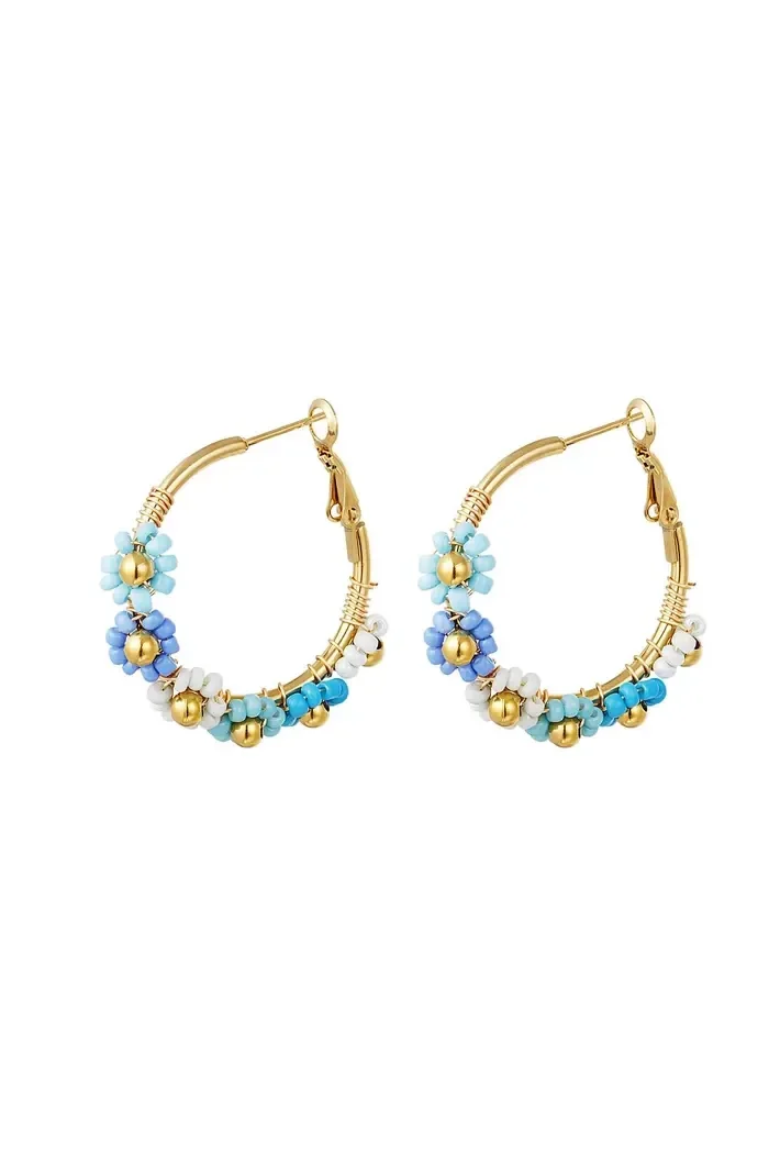 Roestvrijstalen oorbellen, versierd met kleurrijke kralenbloemen. De kralen van de bloemen zijn gemaakt van glas.