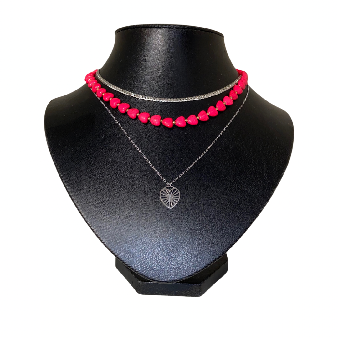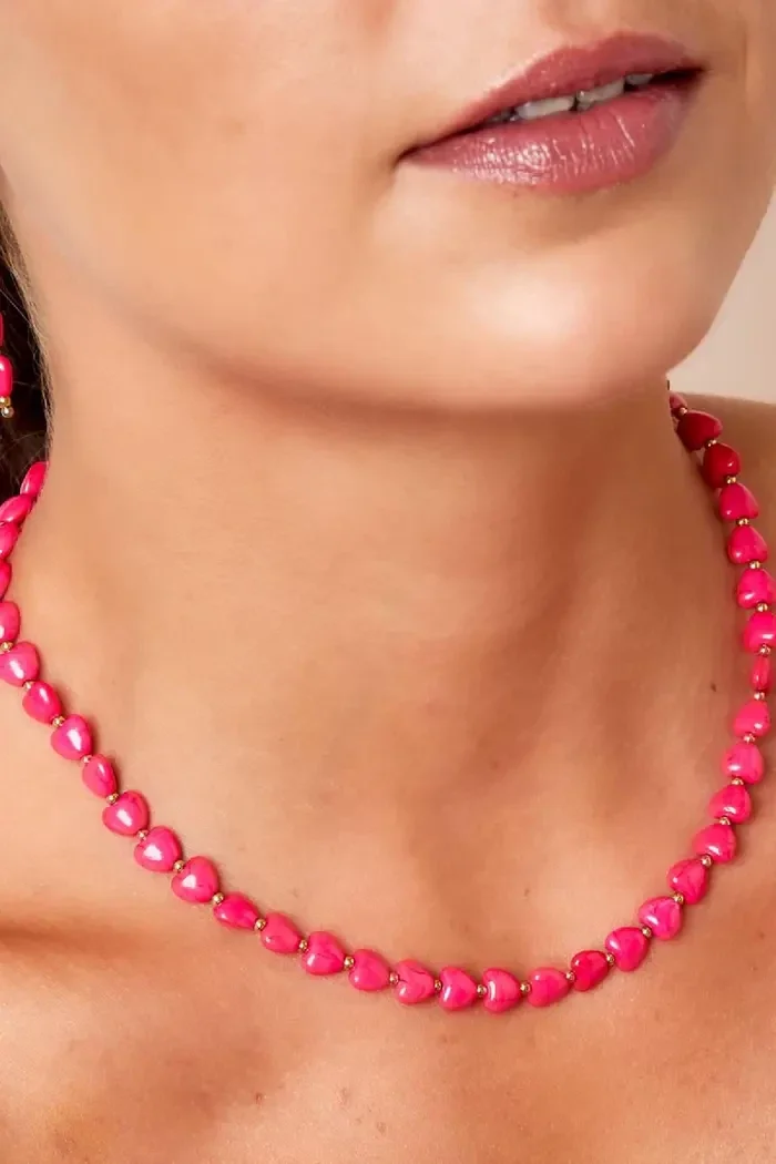 Hoe schattig is deze ketting met roze hartjes op een rij. De ketting is gemaakt van stainless steel in combinatie met roze hartjes gemaakt van natuursteen.